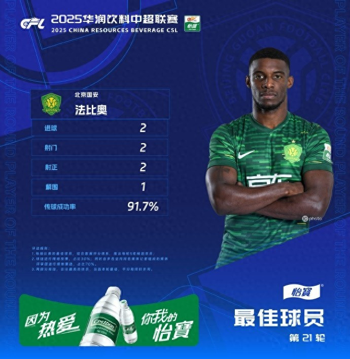 直播吧8月19日讯 中超联赛官方宣布,国安外援法比奥当选第21轮最佳球员。