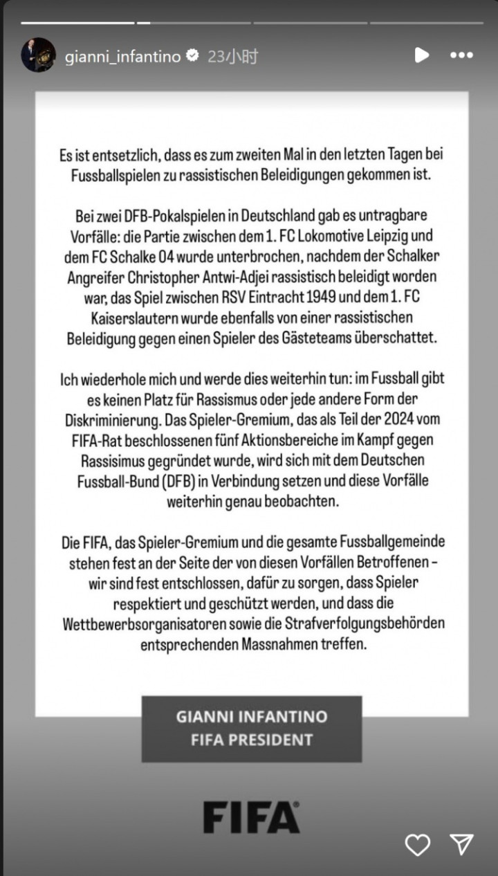 直播吧8月19日讯凯国际足联主席因凡蒂诺更新社媒动态,对德国杯种族歧视事件发声。