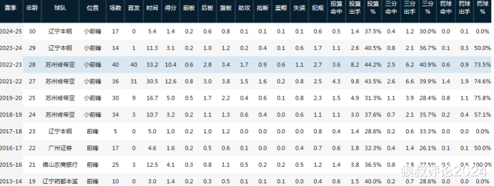 23-24赛季,赵率舟获得了多支俱乐部邀请,他让人意外的是再次回归到辽宁坐“板凳”。过去2个赛季,赵率舟合计代表辽宁出战31场,场均不足10分钟的出场时间,得到2.2分1篮板。