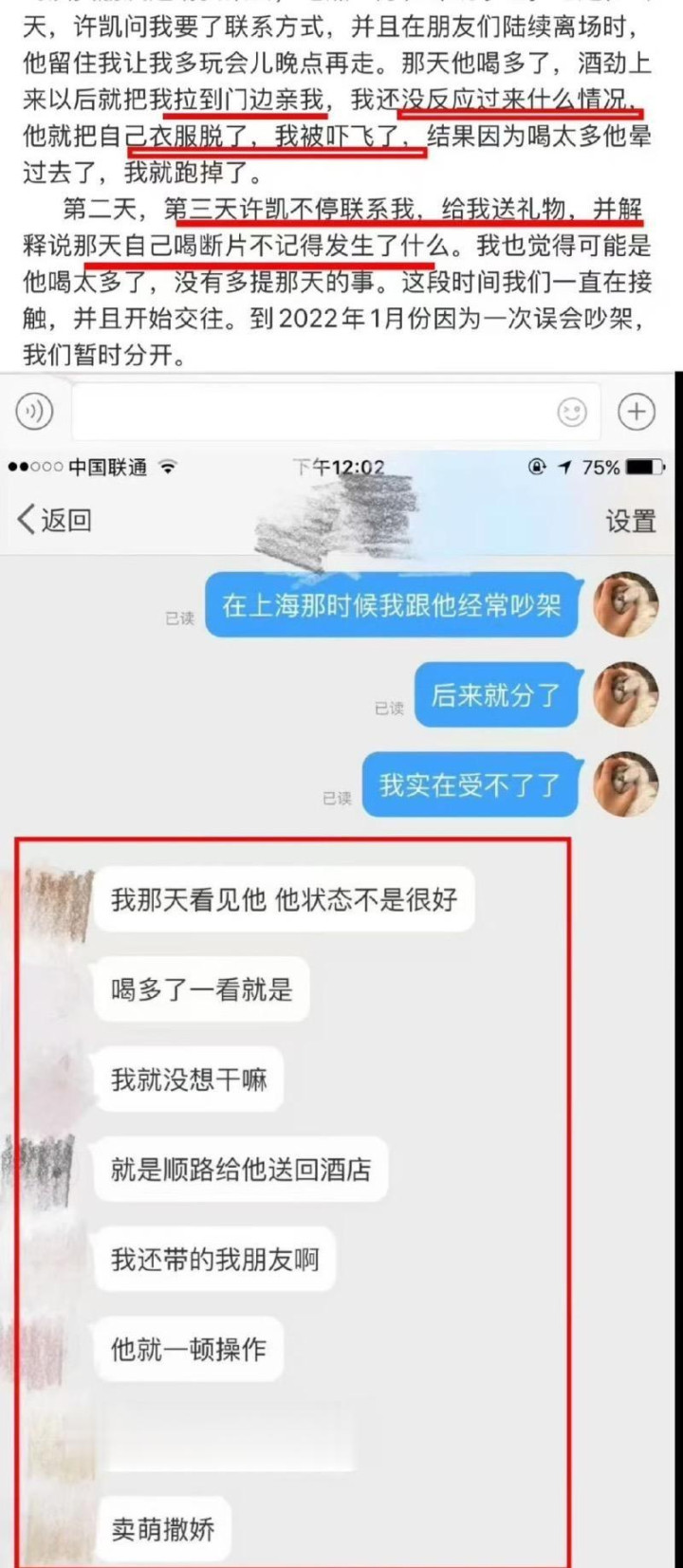 第二天他会以酒醉失忆为由道歉,但若女性没有反抗他便会进一步追求,许荔莎说许凯在与赵晴交往期间,仍然与其他女粉丝有染。