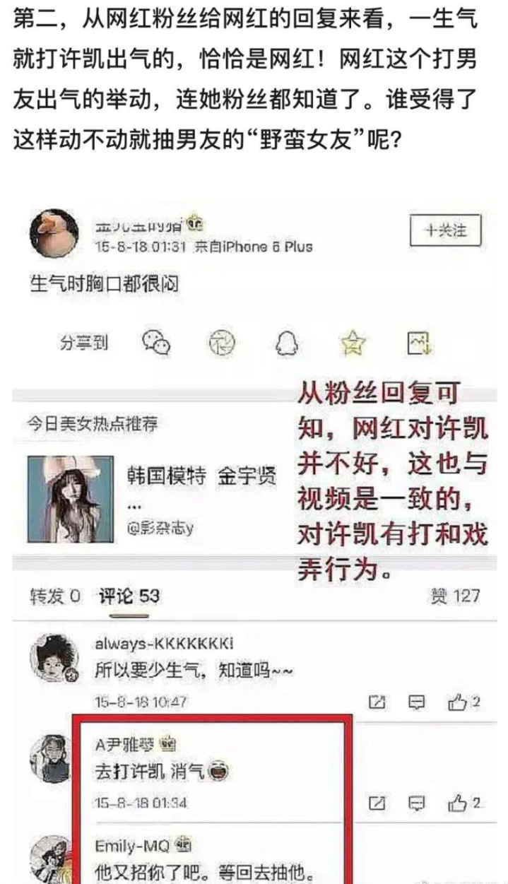 有支持许凯的爆料则指出,实际上是网红前女友性格暴躁经常殴打他,这些爆料称许凯的举动是“正当防卫”。