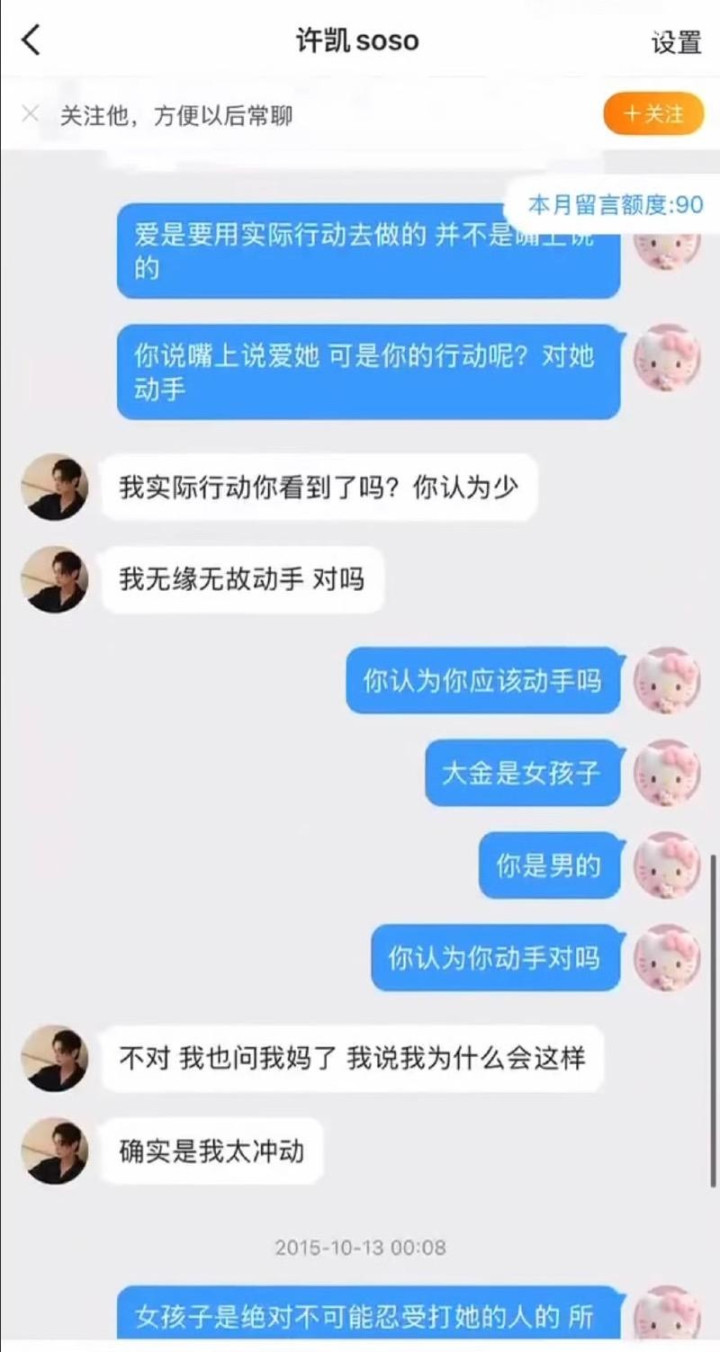 她还出示了与许凯个人账号的聊天记录作为证据,记录中显示“许凯个人账号”曾对此道歉,并表达“我很爱她,比任何人都爱”的言论。