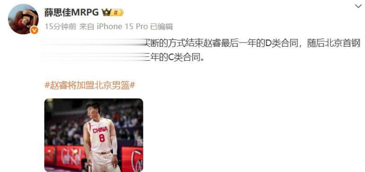 《东方体育日报》记者薛思佳对此表示:“北京队与赵睿重新签订的是一份为期3年的C类合同。 ”