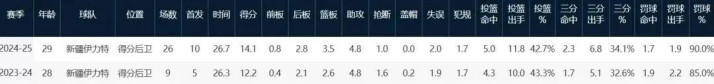 加盟新疆队的第一个赛季,赵睿出战9场常规赛首发5次,场均上阵26.3分钟贡献12.2分2.6板4.9助1.6断,季后赛出战5场首发4次,场均上阵25.2分钟砍下16分3板4.8助1.8断;第二个赛季出战26场常规赛首发10次,场均上阵26.7分钟得到14.1分3.5板4.8助1断,季后赛仅出战1场,上阵18分钟拿下7分4板3助。