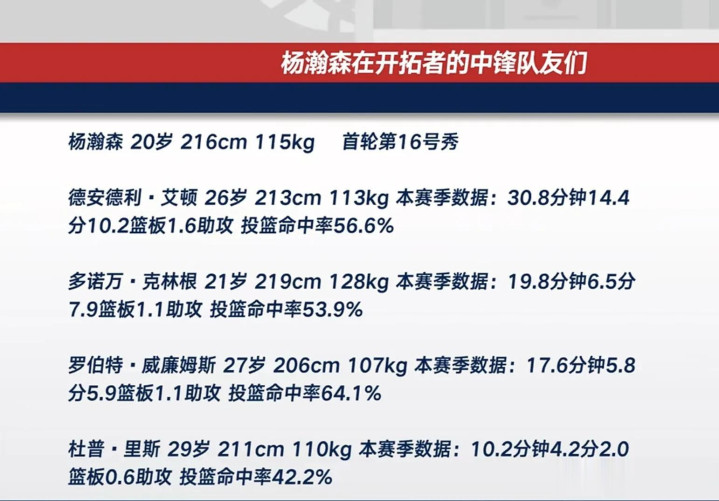 综上分析,杨瀚森的主要竞争对手就是艾顿和克林根,介于威廉姆斯经常打打停停,所以杨瀚森完全有机会,首先立足之地就是适应NBA的节奏和对抗强度,在循序渐进的把握出场时机。想当初强如姚明也是经过20场的洗礼才日渐成熟。