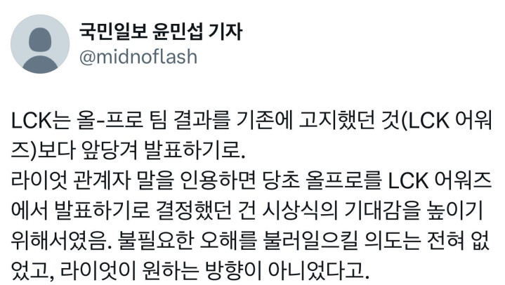虎扑09月02日讯虎扑09月2日讯韩媒国民日报记者在个人社媒爆料LCK计划提前公布年度相关奖项,原文内容翻译如下: