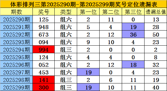 开奖回顾:排列三第2025299期奖号为:300,各位号码遗漏值分别为19、10、11,遗漏总值为40。