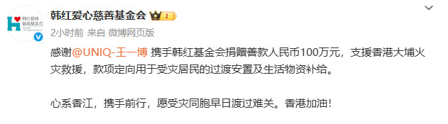 感谢王一博携手韩红基金会捐赠善款人民币100万元,支援香港大埔火灾救援,款项定向用于受灾居民的过渡安置及生活物资补给。