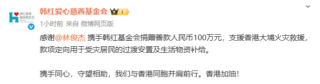 感谢林俊杰携手韩红基金会捐赠善款人民币100万元,支援香港大埔火灾救援,款项定向用于受灾居民的过渡安置及生活物资补给。