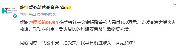 感谢谭松韵携手韩红基金会捐赠善款人民币100万元,支援香港大埔火灾救援,款项定向用于受灾居民的过渡安置及生活物资补给。